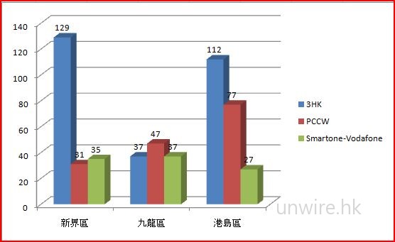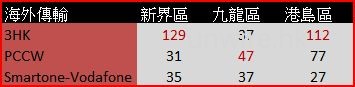 從結果看來 3 HK 於海外傳輸速度方面無疑是相當優秀的,除了在九龍區 3 家的速度都偏低外,其餘地區都錄得高速。得出此速度是相信因為 3HK 本身供流動裝置使用海外頻寬相當充裕所致。PCCW 在海外傳輸速度上,比起 Smartone-Vodafone 略為優勝,看來後者的速度優勢只限於本地。