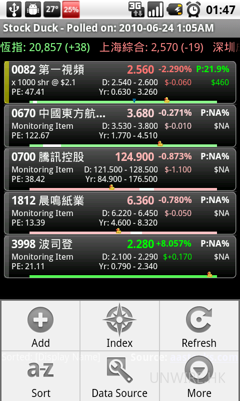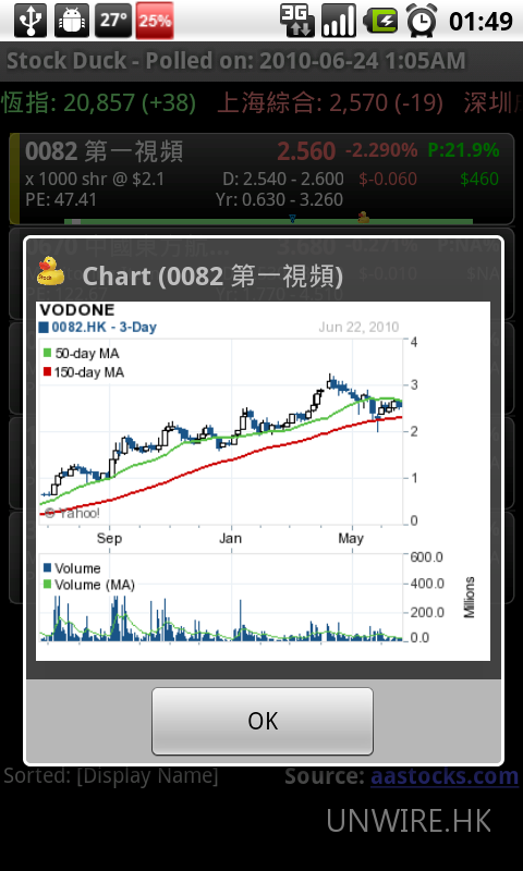 [Android資訊雜誌] 現時本港有數個網站能提供即秒報價,但可惜的是它們都未有手機版介面,使用數吋的螢幕來瀏覽相當不便。而需要緊貼市況的朋友,可利用 Android 軟件《Stock Duck》為你提供最新股票資訊,雖然還是有約一至兩分鐘的延遲,但始終《Stock Duck》是一款免費的股票軟件,所以大家都不要有過高的要求。