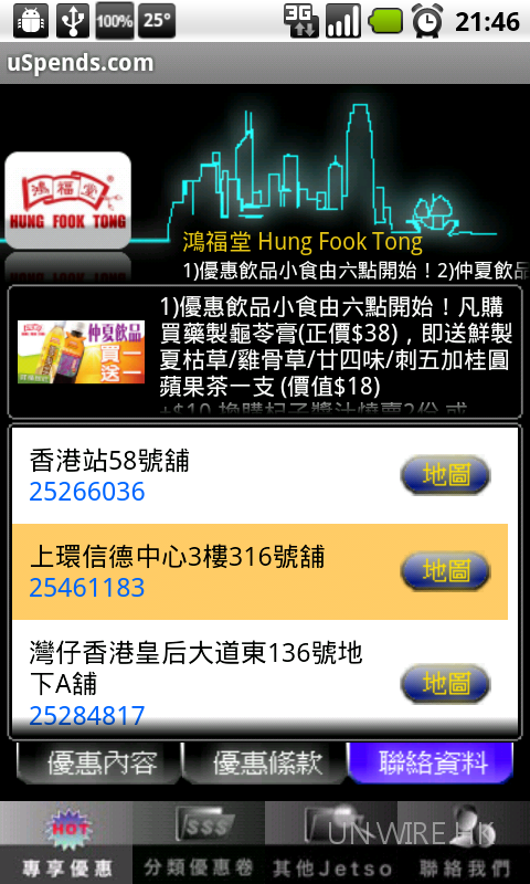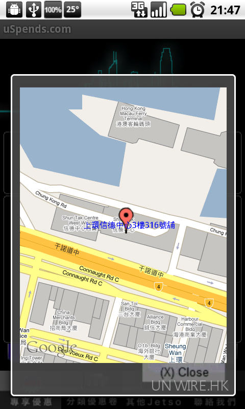但大家要注意每項優惠只限一次,折扣號碼不可重複下載使用。另外,《uSpends.com》更整合 Google Maps 功能,只要揀好店舖後,地圖上會顯示其所在位置,令用家可輕易去到目的地,除了提供專享優惠外,該軟件還搜羅其他城中的優惠,及設有即時分享功能,大家可透過 Facebook 或 Email 工具分享給好友。