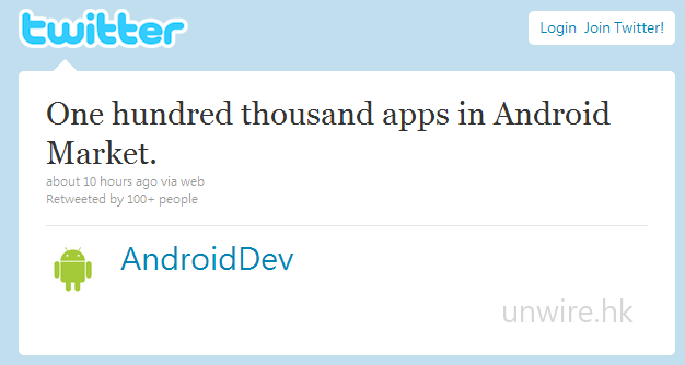 Android手機及平板電腦愈來愈多,加上Android Market的開放,吸引更多開發者參與發展。日前AndroidDev透過Twitter表示Android程式數目剛突破十萬大關,Android強大了!各位Android用家也要一齊賀一賀吧!