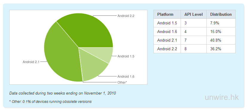 跟據Google透過Android Market存取程式時所偵測到Android OS版本的統計得知,Android 2.2比起上個月的33.4%提升至36.2%, Android 2.1則由40.4%輕微上升至40.8%。雖然是理所當然的事,但就比起想像中要慢,主流仍以Android 2.1為主。現時能夠支援Android 2.2的手機或平板電腦並不算多,連剛推出的Archos平板電腦也沒有預期中預裝Android 2.2出貨,不知道廠商為何不直接跳過Android 2.1而直上Android 2.2呢?另一邊廂Android 2.3亦快將出現,到時候Android 2.3又變成了該裝置的獨有賣點吧?