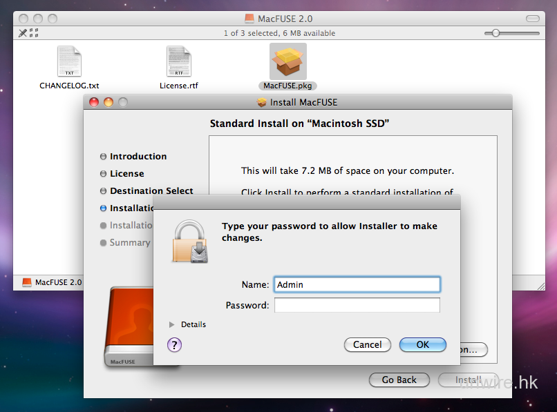 下載 MacFuse 後執行安裝封包,根據指示輸入管理員密碼,安裝完畢後需要重新啟動,如用家已將 NTFS 硬碟接駁到 Mac 上,重啟可能需要較長的時間。