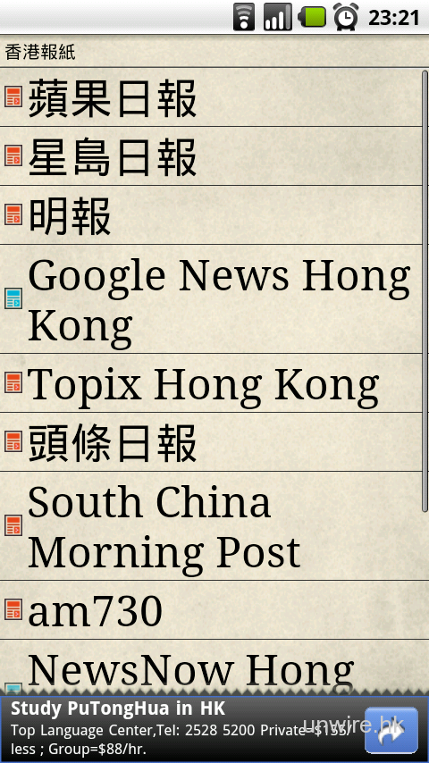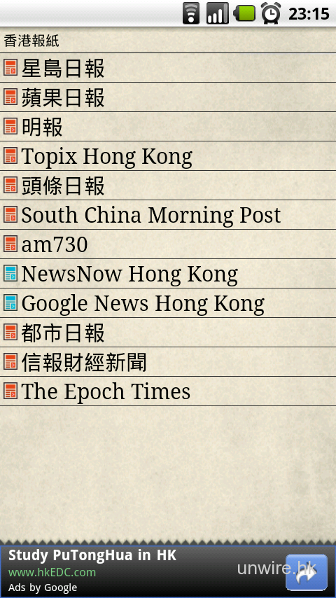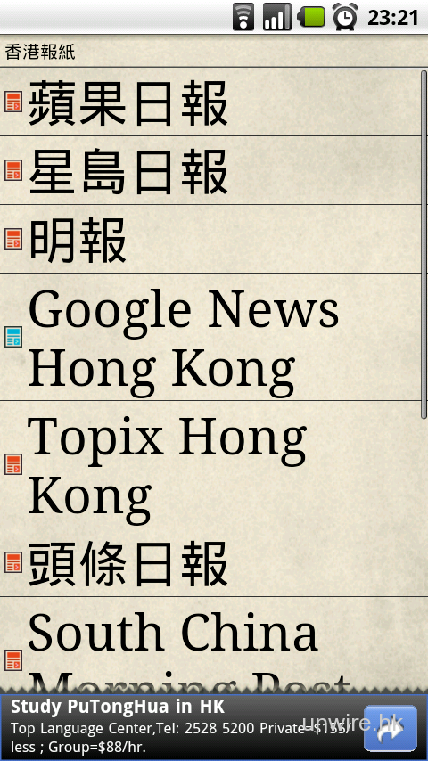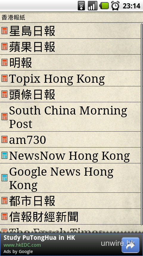 《香港報紙》已內建了蘋果日報、信報財經新聞、明報、星島日報、頭條日報、都市日報、South China Morning Post、am730、The Epoch Times、Google News Hong Kong、NewsNow Hong Kong及Topix Hong Kong多個選擇,實際上就是提供連結並讀耳該網站資料。不要以為會將資料重新整理,如果該網站的Mobile版本連結改變,相信會不能閱讀也不定。但方便之處是集合了香港大部分常去的報紙網站,不用利用瀏覽器自己到處走。筆者走到蘋果日報網站看也算是方便,介面當然與瀏覽器所看到的一樣。