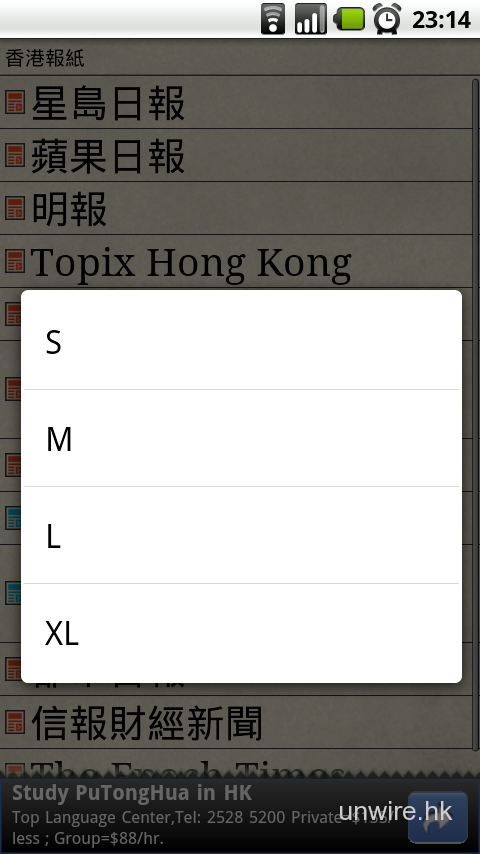 《香港報紙》提供四種不同大小字型作閱讀,但只限選擇不同報紙畫面,確實有點取巧。預設值是M大小字型,另外有S、L及XL各種不同大小,筆者相信M碼已經十分適合大部分用家,除非你真的是「大近視」吧!