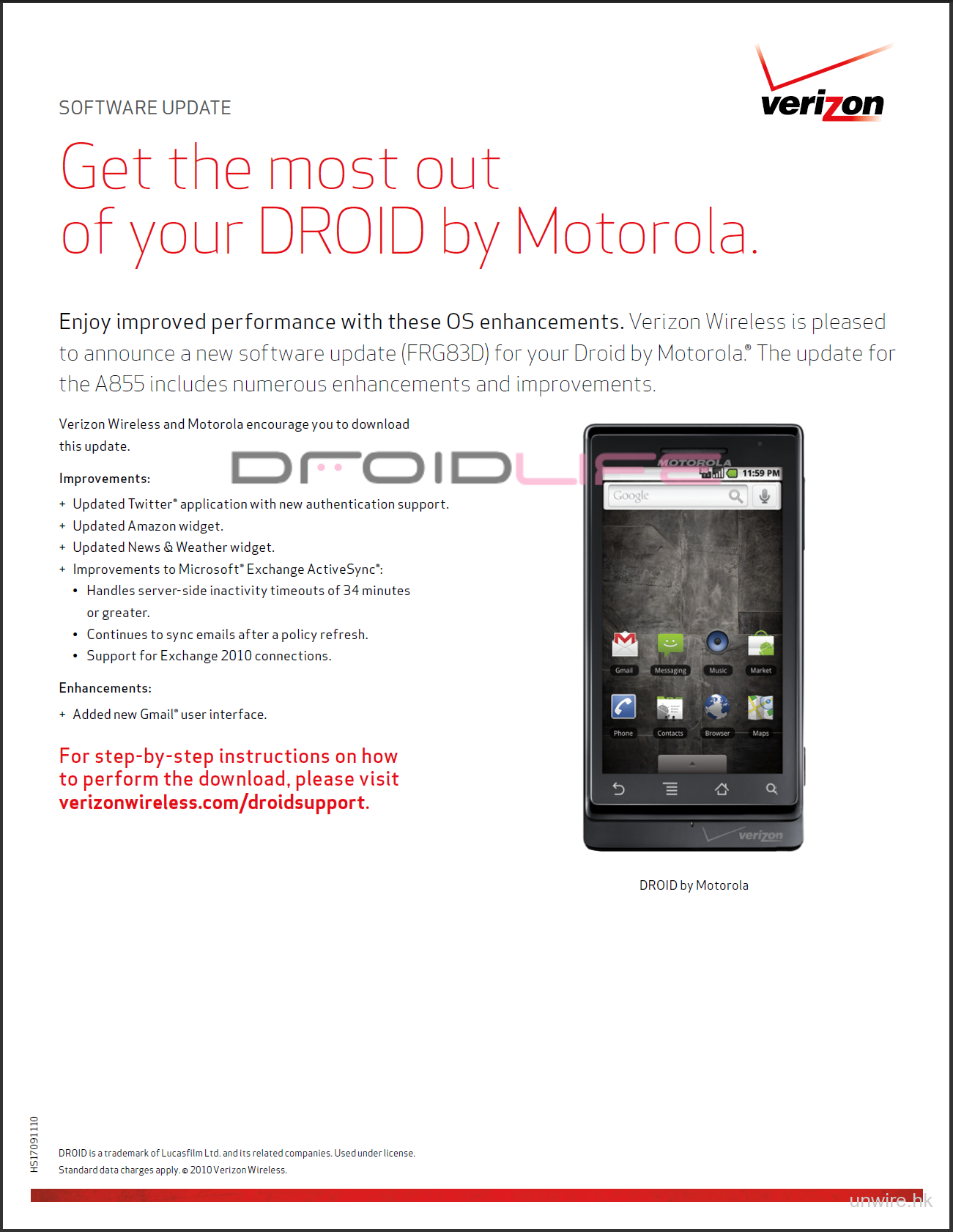 Motorola在北美地區推出的Droid手機,實際上就是大家所熟悉的Milestone,只是針對不同地區而有別。日前Motorola透過電訊商Verizon表示,新的FRG83D升級將會推出,相信就是Android 2.2.1版本。