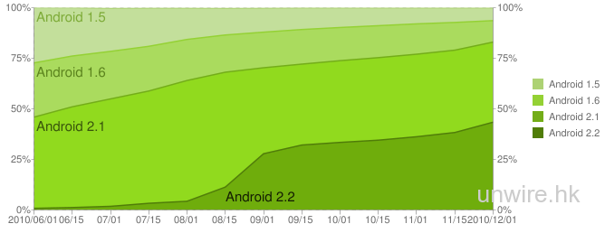 又是每月例牌的Android裝置使用OS版本的統計時間。今個月Android 2.1+裝置已經由上個月的77%升至83%,其中Android 1.6則由15%降至10.6%,Android 2.1則由40.8%降至39.6%,Android 2.2則由36.2%升至43.4%,Android 2.2首次超越Android 2.1成為最大的用戶群。