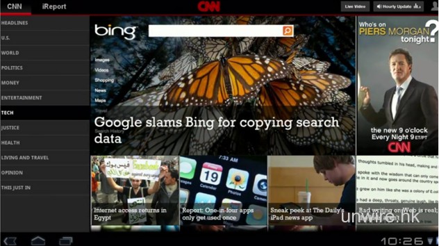 發佈會中,CNN示範了他們將會為 Honeycomb 推出的程式,除了能閱讀文字新聞外,更能收看視像直播。配合 Android Tablet 的前後鏡頭,用戶可以在 iReport 平台即時發佈新聞,傳送到世界各地。