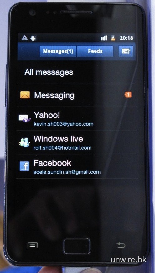 Social Hub 能整合電郵、短訊、Facebook、Twitter 等社交系統,支援Push。這種一站式的整合於各智能手機上已越來越普遍。