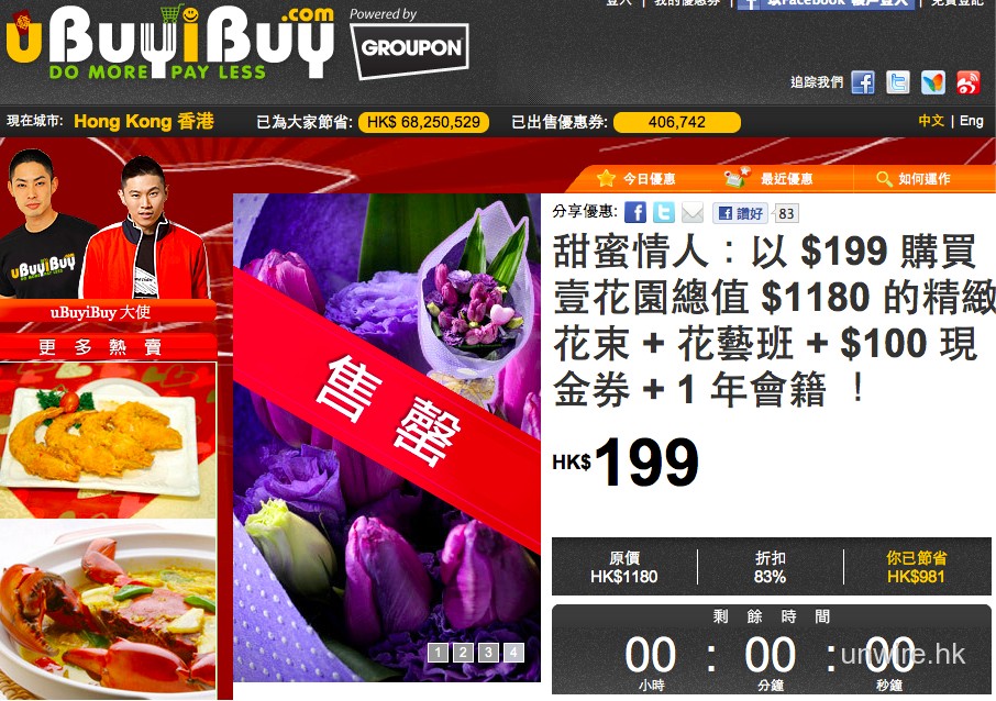 - 香港 Groupon(uBuyiBuy)與花店壹花園合作推出「甜蜜情人」優惠:以 $199 購買總值 $1180 的精緻花束 + 花藝班 + $100 現金券 + 1年會籍。