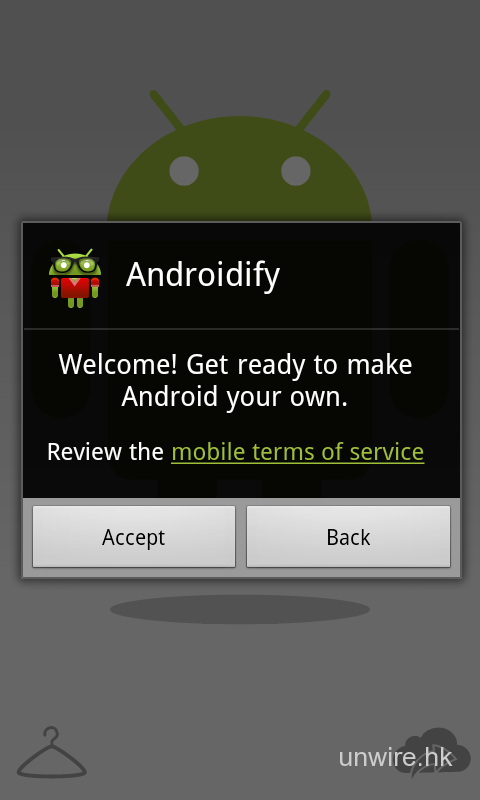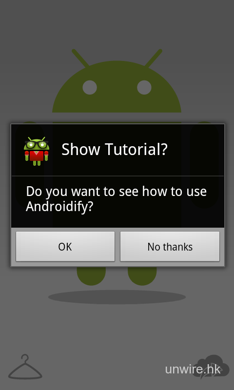 安裝好《Androidify》後第一次使用便會見到以上畫面,除了講解一下用途外,亦會有教學教你使用。不過實際上一般新手也可以輕易製作,所以可以直接跳過,有興趣的用家還是可以看一看吧!