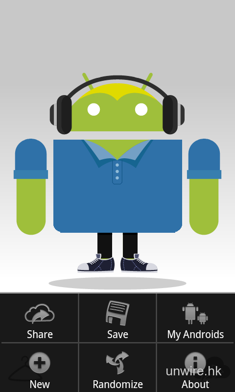 只要你按下Menu再選擇Randomize便會自動幫你隨機去做配對,你按下多次總有一款合你心意。如果心仍然十五十六,可以按下Save將有興趣的圖像儲存起來。當你Save了一大堆頭像後,再按下My Androids便會見到右邊畫面,打橫一排任你選擇,這樣便不會錯過任何頭像款式。