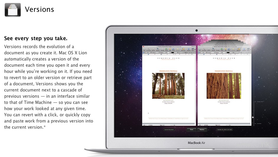更多截圖可參考 MacStories 或 WorldofApple 的報道。另一方面,隨著 Mac OS X Lion 測試版公佈,蘋果網站的 Lion 頁面亦稍有更新,例如有新功能 Versions 的介紹。