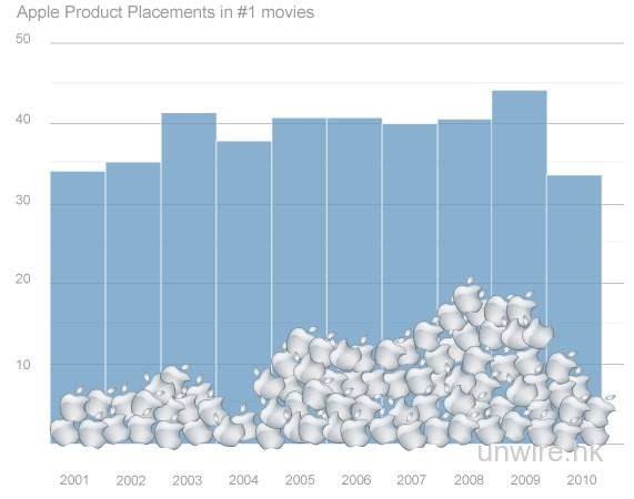 據統計,Apple產品在2009年出現得最多,但2010年則稍為回落。其實不只是荷里活電影,在港產片中也時有出現。