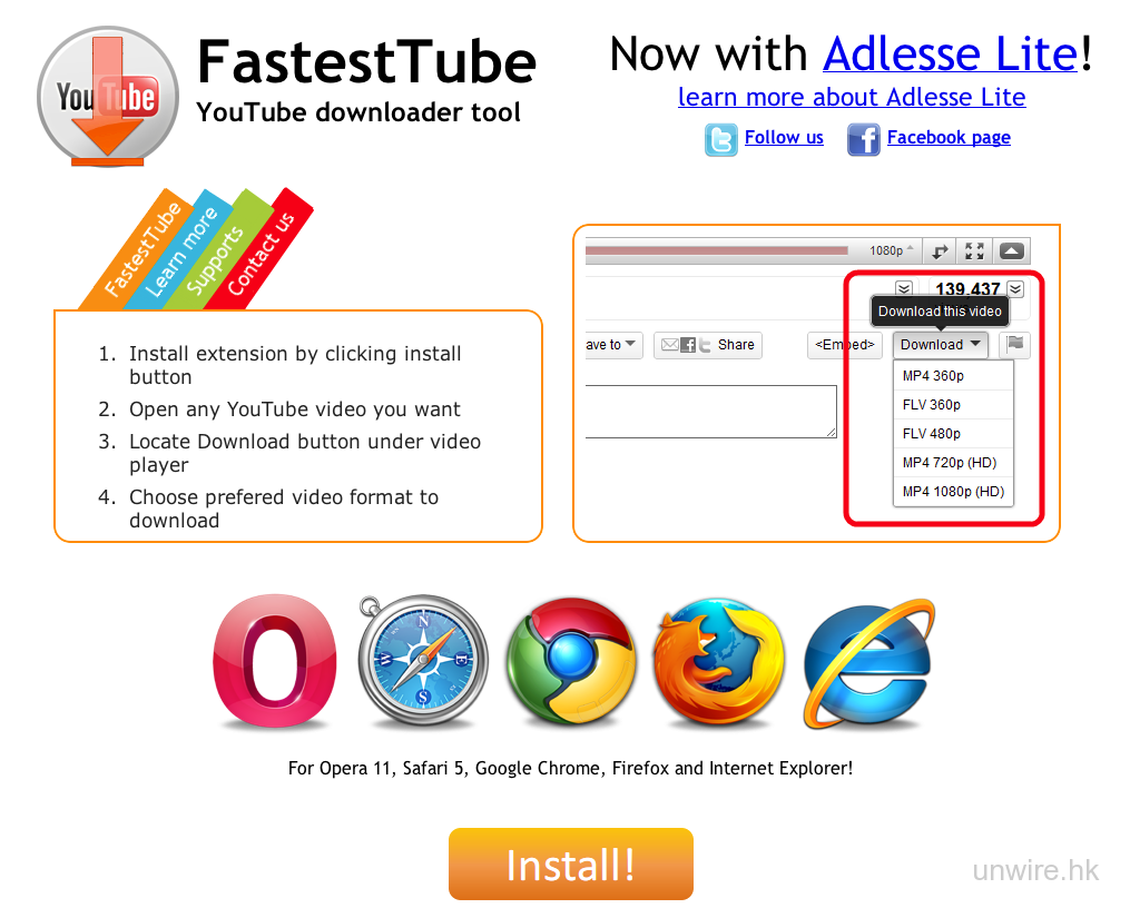 網民 Kwizzu 製作了一個名為 FastestTube 的瀏覽器外掛元件,支援 Opera、Safari、Chrome、Firefox 及 IE 等 5 大瀏覽器,安裝後用戶直接在 YouTube 播放器直接按制下載影片,可謂十分方便。