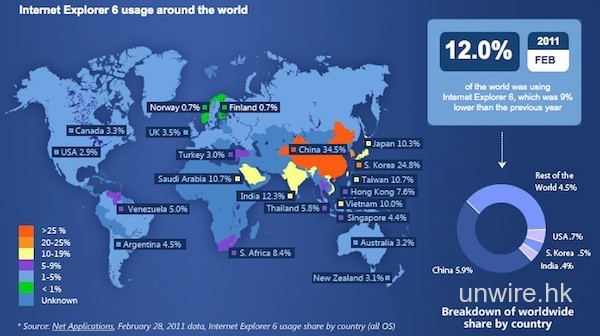Internet Explorer應該算是最惡名昭彰,但又最多人使用的瀏覽器。尤其是舊版本,又慢又多漏洞。其讓人厭惡的程度,連Microsoft也要出手讓這惱人的瀏覽器消失。沒錯,最近Microsoft開了一個IE6倒數網站,鼓勵IE6的用家捨棄這接近10年前開發的瀏覽器(然後下載最新的IE9)。上面附有一個世界地圖,顯示哪個地區最多人用IE6,恭喜中國又拿第一。難得Microsoft肯痛改前非,IE6的用家們快點換個瀏覽器吧,當然不一定是IE9(注意IE9並不支援Windows XP)。