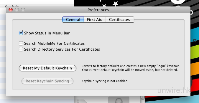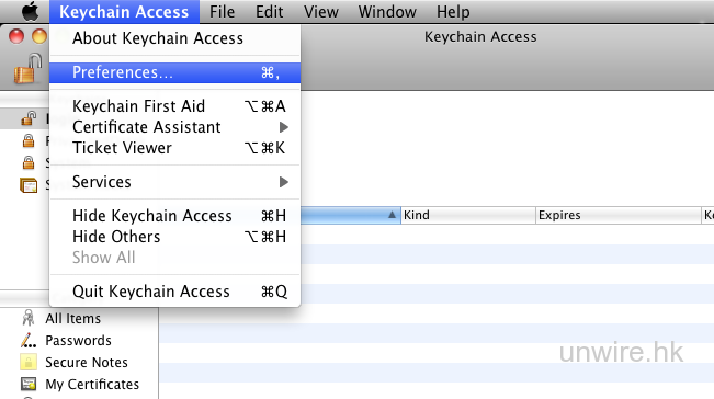 點撃左上角的 Mac 功能表,在 Keychain Access 中點選 Preferences。
