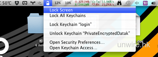 功能表會多了一個鎖頭圖示,點撃 Lock Screen 便可立即將電腦鎖上,但所有軟件依然會在背後運作。