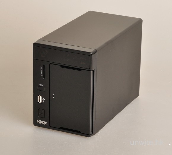 擴充功能也是 N2200XXX 之賣點,除在機後設有兩個 USB 2.0 埠,供連接印表機、硬碟 及 Flash Drive外,更在機前加入一個 SD Card 插槽,可對應最高 32GB 容量的 SDHC 記憶卡。利用機前的「COPY」鍵,就可自動將卡上所有檔案複制到 NAS 指定位置,同時更支援 FAT32 及 NTFS 格式讀取。