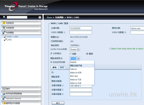 有線網絡連接方面,Thecus N2200XXX 機後提供兩個 Gigabit LAN 網絡連接,各對應 1,000Mbps連接速度、Wake-Up On LAN 及 Jumbo-Frame 技術,除可獨立運作以連接內聯網或互聯網外,更設有6 種運作模式包括:Local balance、Failover、Balance-XOR、802.3ad、Balance-TLB 及Balance-ALB。當中,Load balance模式可,可將兩條連線組合,以打造 2,000Mbps 的超高連接頻寬。