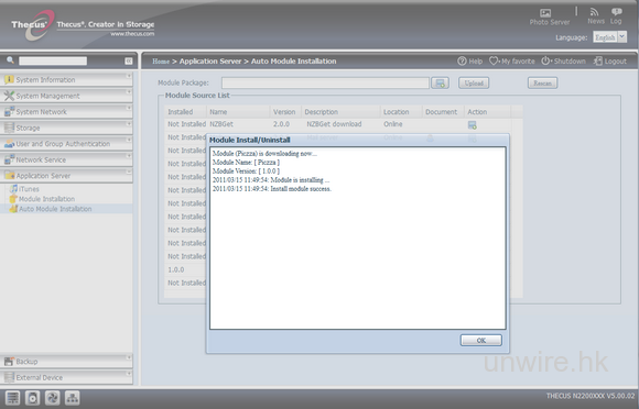 Firmware V5 的使用介面也全面革新,功能選單更符合使用者的需求,操作上也更加得心應手,更內建 Help 小幫手,協助用家進行設定。功能方面,Thecus N2200XXX除預設各樣「標準」功能如 SAMBA、FTP、iTune Server、Printer Server外,更加入開放原始碼外掛模組功能,讓用家可依照個人需要自製功能模組,而 Thecus 也預先為用家編寫了超過 10 個功能模組包括:Piczza、ThecusShare等等,用家只需一按即可為 NAS加入新功能。