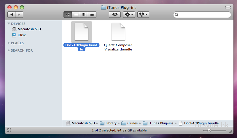 如 iTunes 正在使用,將之退出。然後將解壓縮了的 DockArtPlugin.bundle 搬移到 /Library/iTunes/iTunes Plug-ins 內。