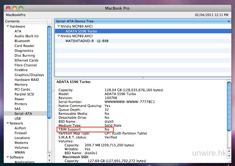 筆者的 13” MacBook Pro 2010 早前已更換了一個 A-DATA S596 Turbo 128GB SSD,從系統資訊中可見,TRIM 功能並未開啟。