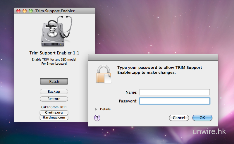 打開 TRIM Enabler,按 Patch 進行修改,期間需要輸入管理員密碼。
