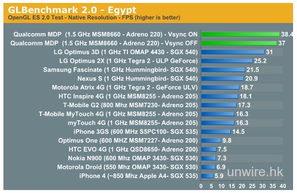這MSM 8660,在HTC即將推出的EVO 3D和Pyramid上都會有配備,以1.2GHz的速度運行。不過,這個測試結果不代表全部,因為在測試時MSM 8660是在接駁了電源的開發平台上運行,而且測試是在各機款的預設解像度上進行,所以也不能算是一個很公平的測試。(看iPhone 3GS表現比iPhone 4好就知道)