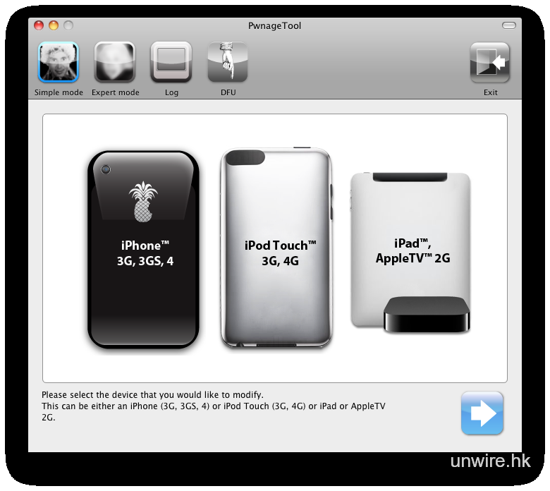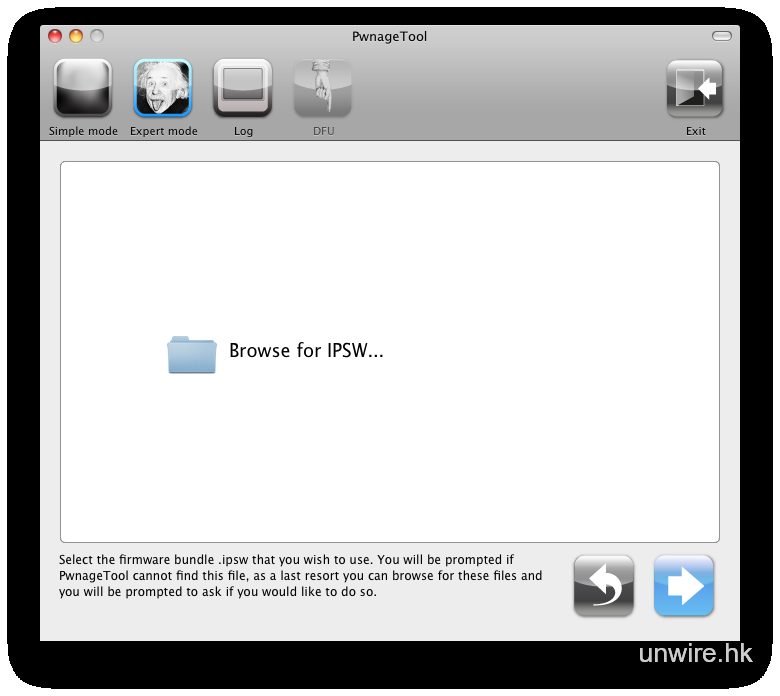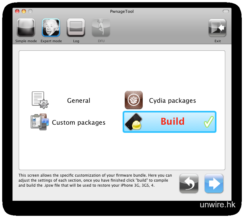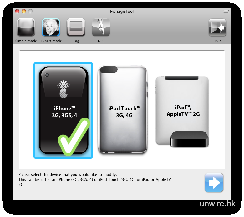 打開 PwnageTool 4.3 後,點選 Expert Mode 及 iPhone,然後按箭咀繼續。