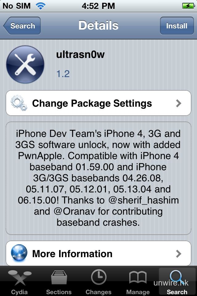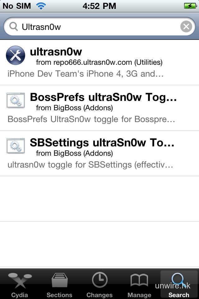 打開 Cydia,搜尋 UltraSn0w,安裝後重新啟動,Jailbreak + Unlock 大功告成!