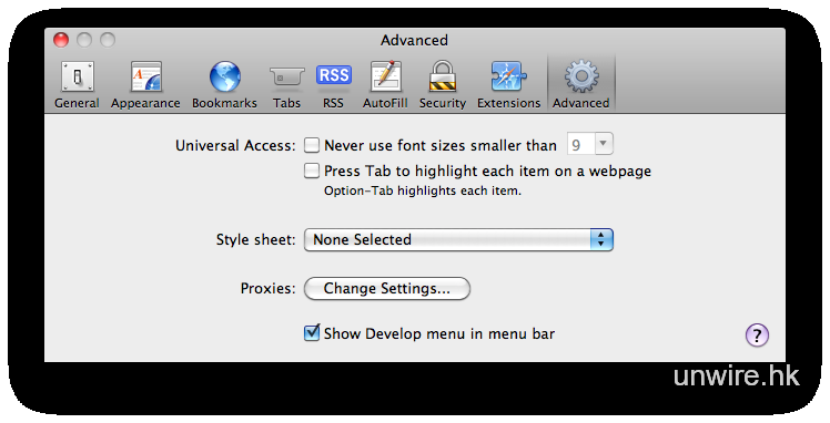 在 Advanced 頁面中勾選 Show Develop menu in menu bar,然後關閉 Preferences 視窗。