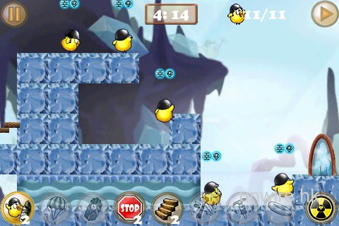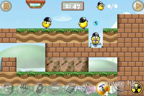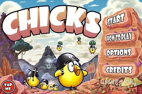 「One Two One Two,開步走!」遊戲中玩家帶領著一班小雞穿過不同的障礙,實行遇神殺神,遇佛殺佛!《Chicks》裡面的小雞造型可愛,相信不少女生看見一定大呼「卡哇衣」!小雞們樣子是Cute,但可惜笨笨的,只會一直左搖右擺的向前直走,看見前方有障礙,都只能碰壁硬撞!這個時候,身為領軍的玩家可就重要了,玩家需要利用屏幕底部的不同指令,Order小雞們的不同動作,例如:爬山、跳傘,甚至礸石等,好讓他們能安全到達終點。10隻小雞,玩家最少要成功帶領6隻逃脫,那當然,成功逃走的愈多,分數亦會愈高啦!