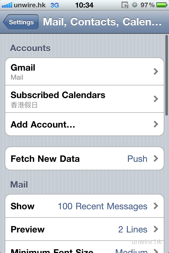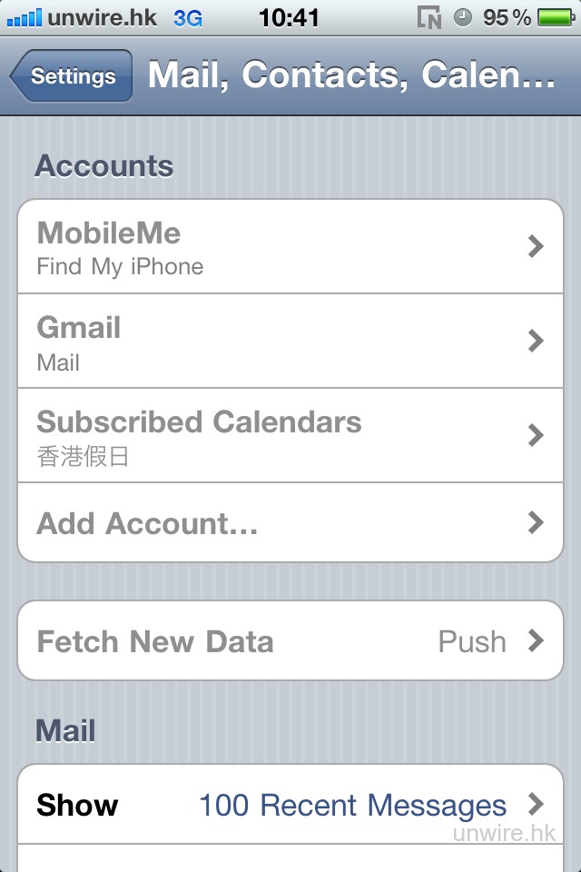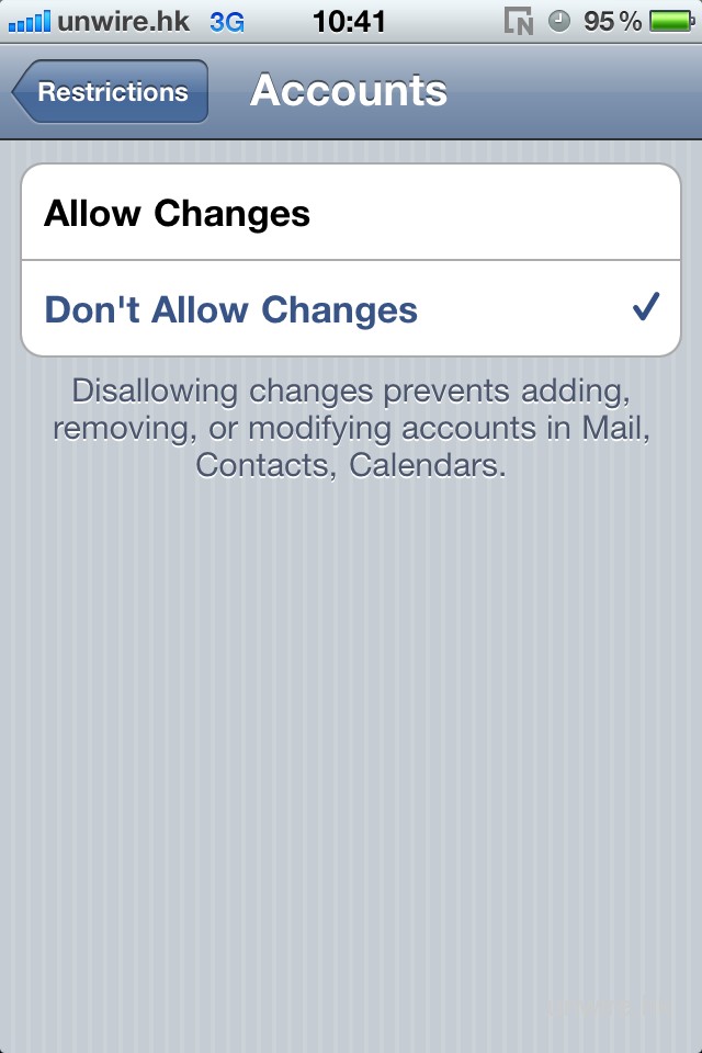 這樣,Mail, Contacts, Calendar 中的設定便無法隨便修改,除非輸入 Passcode 解除 Restrictions。