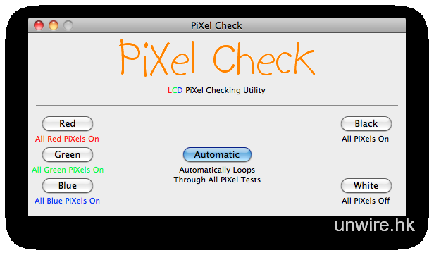 使用方法跟一般檢查死點、光點的軟件無異,軟件會顯示全紅、綠、藍、黑、白畫面,用戶可利用肉眼檢查 LCD 有否瑕疵。
