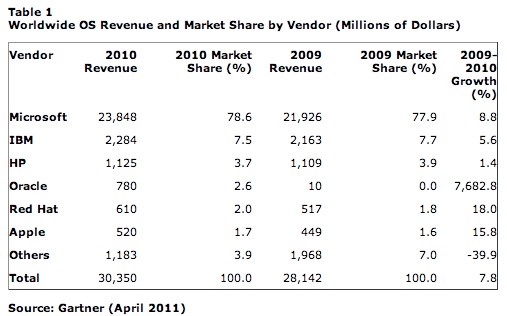 這個調查中除了個人電腦,也計算了伺服器的操作系統在內。Microsoft的238億元收入,比起其他公司的多出至少一個數位。不過,他們的增長率不是最高,而是錄得7682.8%增長的Oracle(這是因為他們吞併了Sun Microsystems)。