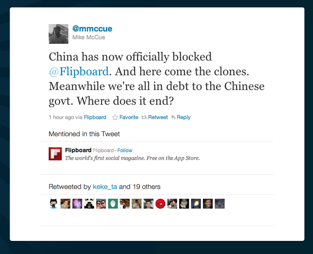 Flipboard總裁Mike McCue就表示,大概除非他們為中國用家封鎖Facebook和Twitter,不然應該是解封無望。他亦表示中國有如ICare、MagSina和NetEase等山寨軟件,其外觀與Flipboard一模一樣,所以他也奇怪,到底中國政府是在保護自己的政權,還是保護自己的產業…可能兩者也是吧。