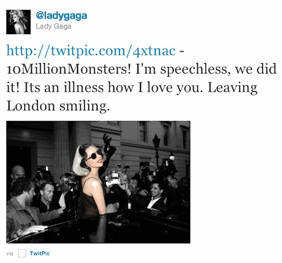 Twitter在香港好像不能好好的流行起來,不過在歐美和日本,Twitter的普及程度甚高,最近Twitter的發展就去到了一個新的里程碑,有人的追隨者數量突破一千萬,而那人就是Lady Gaga。緊隨其後的是加拿大歌手Justin Bieber。在Facebook上Lady Gaga有三千四百萬名「粉絲」,不過既然Facebook的用家多Twitter三倍多,也是難怪的。比起Twitter,香港人可能用微博還比較多? 來源:All Twitter