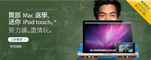去年的Back To School也是在差不多時間,也就是五月尾開始的,以往的Back To School活動,都是讓學生以優惠價購買Mac電腦(全年優惠)之餘,再送iPod Touch或同價或以下iPod一部,以去掉存貨以便在秋季推出新款的iPod系列。今年也應該不會有太大變動。所以想買Mac或iPod的朋友,如果你是大學生或者有朋友是大學生,不妨等多一會。