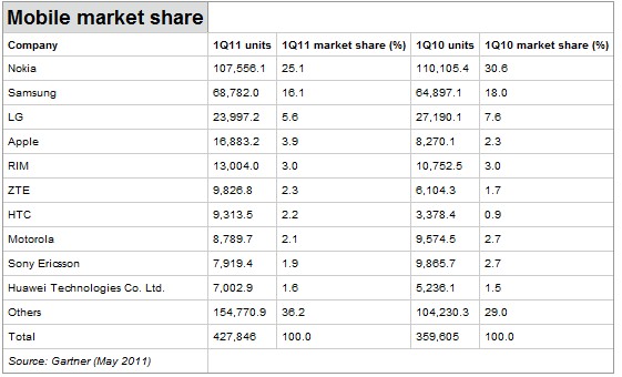 根據Gartner公司對手機市場佔有率降的最新研究顯示,Nokia 手機的全球市場佔有率降至1997年以來的最低水平。2011年第一季度,Nokia共售出1.076億部產品,較去年同期下降5.5%。 Gartner的研究發現,2011年第一季度,全球移動通信設備的銷售總額達4.278億美元,較2010年第一季度增長19%。研究顯示,今年第一季度,蘋果iPhone手機的銷量上漲100%,至1,860萬部。 來源:mobilecrunch
