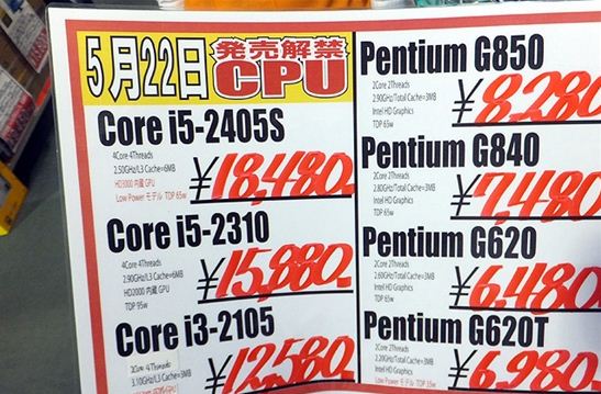 Core i5-2405S :售價17980-18980日元(約hkd$1700),Core i5-2310 :售價15480-16480日元(約hkd$1500),Core i3-2105 :售價11980-12980日元(約hkd$1200),Pentium G850 :售價7780-8980日元(約hkd$650)。
