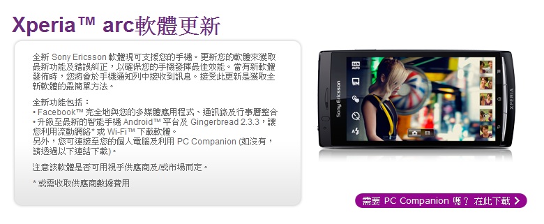 Sony Ericsson 今天宣佈即日開始為Xperia Arc、Neo 及 Play 提供 Android 2.3.3 的更新,更新內容包括Facebook™ 完全地與您的多媒體應用程式、通訊錄及行事曆整合,還有升級至最新的智能手機 Android™ 平台及 Gingerbread 2.3.3,讓您利用流動網絡* 或 Wi-Fi™ 下載軟體 . Sony Ericsson 官方提供兩個新方法: 透過 OTA 下載更新。 在 PC 上安裝 PC Companion 2.0 使用 USB 線進行軟體升級。