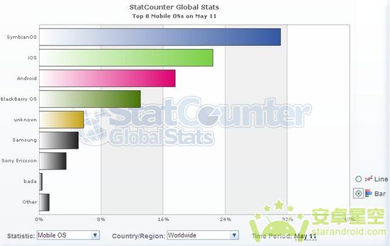 近日美國調查公司StatCounter分析了五月份各操作系統在不同國家和地區的市場佔有率,操作系統前八強依次序分別為SymbianOS,iOS,Android,BlackBerry OS、Unknown、Samsung、Sony Ericsson和bada,所佔有率為31.14%、22.36%、17.56%、13.03%、5.72%、 5.03%、3.48%和0.37%。