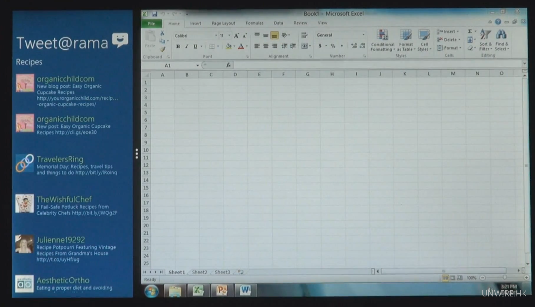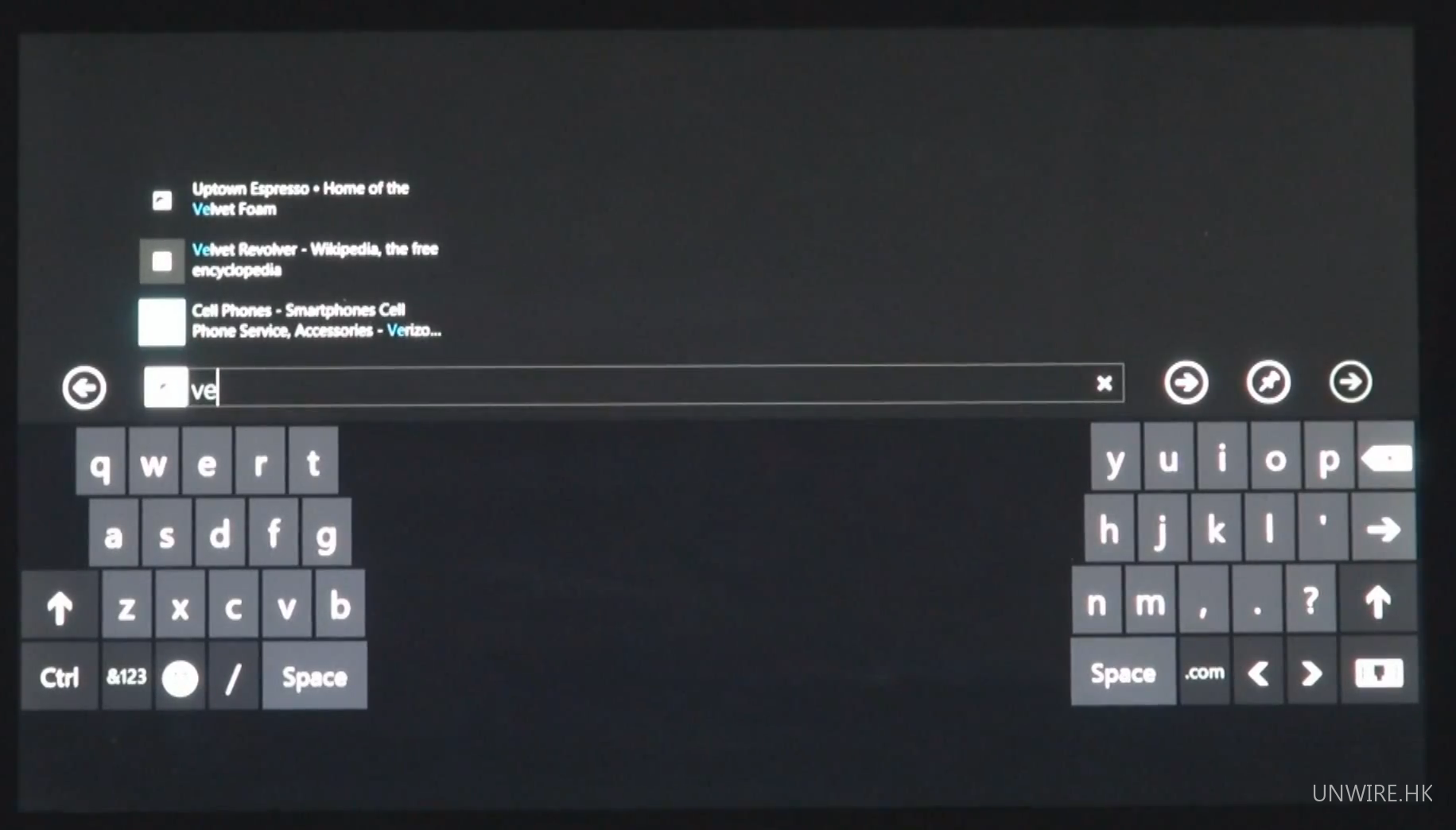 今天微軟分別在 D9 與台灣 Computex 展示了 Windows 8 的 Tablet 介面,其開始頁使用了 Windows Phone 7的 “Tile” 介面,讓用戶可以更直覺地以指尖作各種操作。所以小工具都是可以自定大小及隨時以全屏幕執行。瀏覽器內核使用了 Internet Explorer 10 的新技術,透過上方下拉式選單可以進行 Tab Browsing 等。而在示範片段中,執行過程亦見相當流暢。