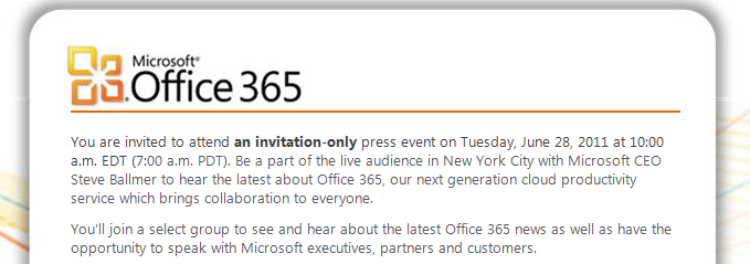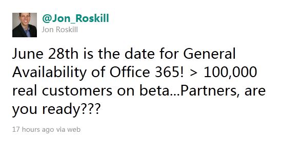 Microsoft 副總裁Jon Roskill今天在Twitter上表示,Office 365 雲端生產力軟體將在2011年6月28日正式啟用, 目前他們已有10萬個用戶在參與Beta測試工作。Office 365包含Microsoft Office,SharePoint Online,Lync Online和Exchange Online等雲端生產力軟體,它將用來替代微軟BPOS服務套裝,所有之前的在線服務客戶也將被轉換到Office 365。 ▼Microsoft Office 365 官方介紹影片 來源:winrumors