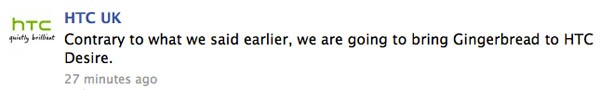 不似iOS有明確的說明更新會支援到哪一代的產品,Android的更新推出後,用家也只能等廠商方面公佈會否有更新,或等待自製系統的更新。HTC Desire的一眾用家,之前聽到HTC表示不會為Desire推出Gingerbread更新後,可能已準備換機,但最近HTC方面又改口說,會推出Gingerbread更新。早前HTC說不推出更新的原因是,Desire的記憶體不足以順暢運行Gingerbread,但現在則表示會推出更新,大概會把其中一些功能砍掉,減輕對手機的負擔吧。 來源:Engadget