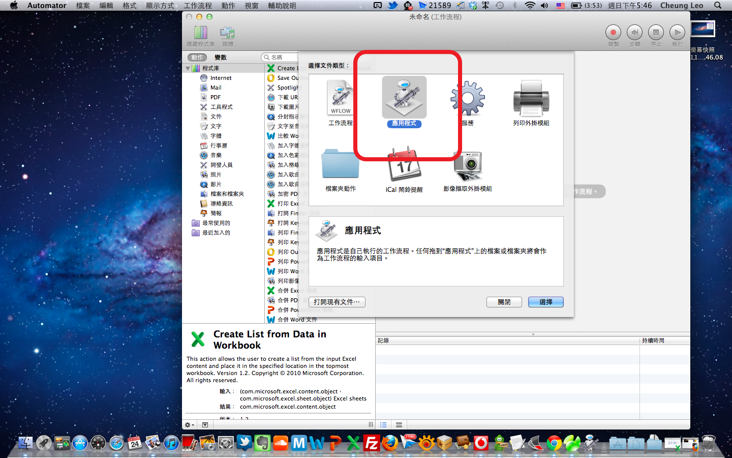 Step1. 於右上方 spotlight 輸入「Automator」啟動程式,進入程式時先選擇建立「應用程式」。