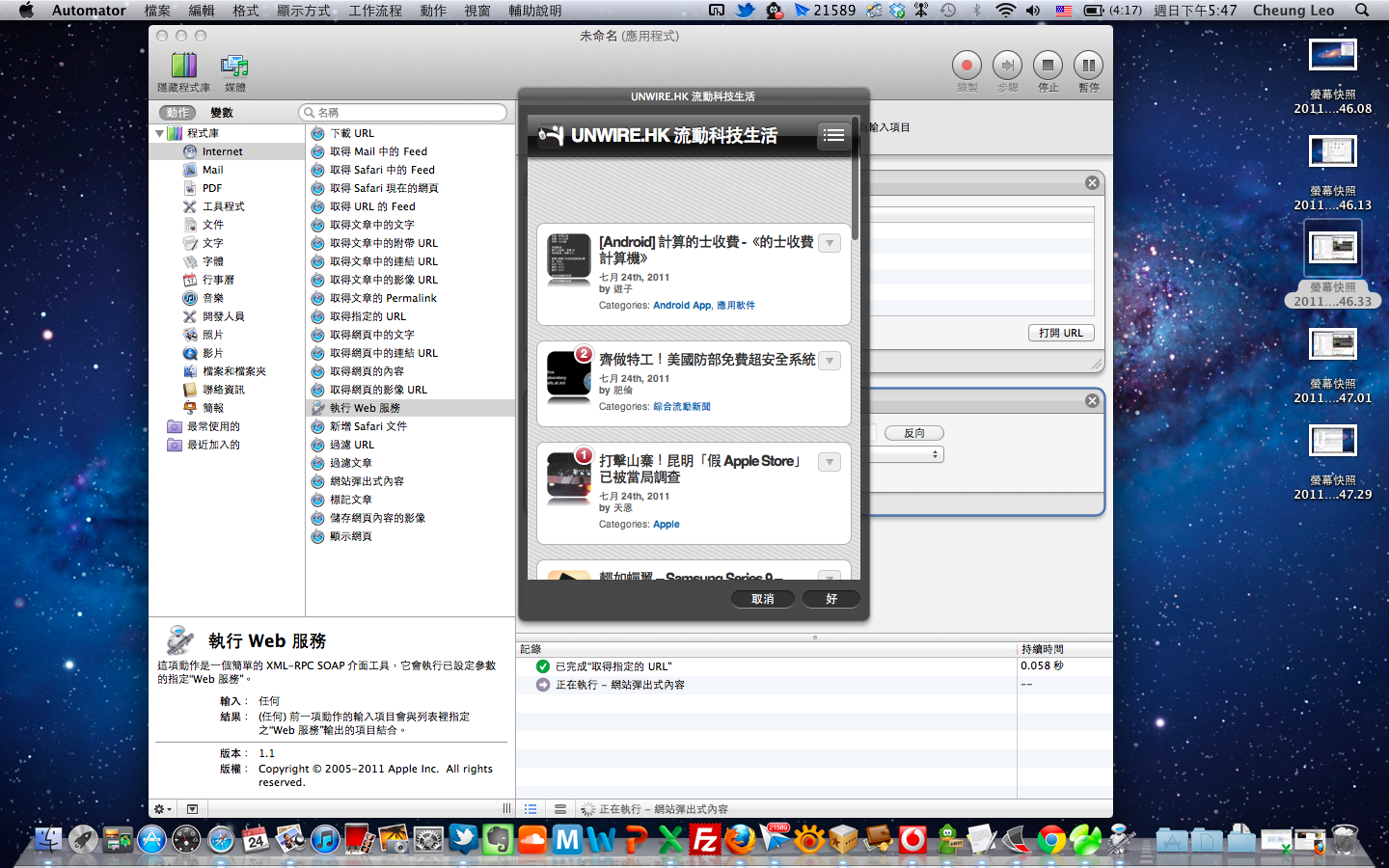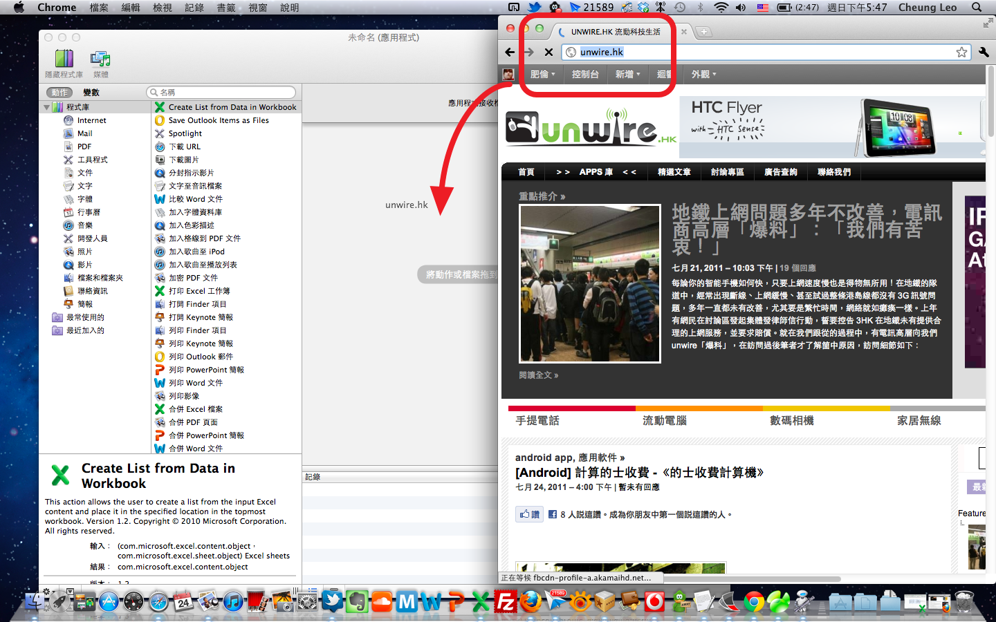 Step2. 直接從瀏覽器把網址拖放到 Automator 的空白位置中,就會自動建立一個取得該網址的「工作流程」。