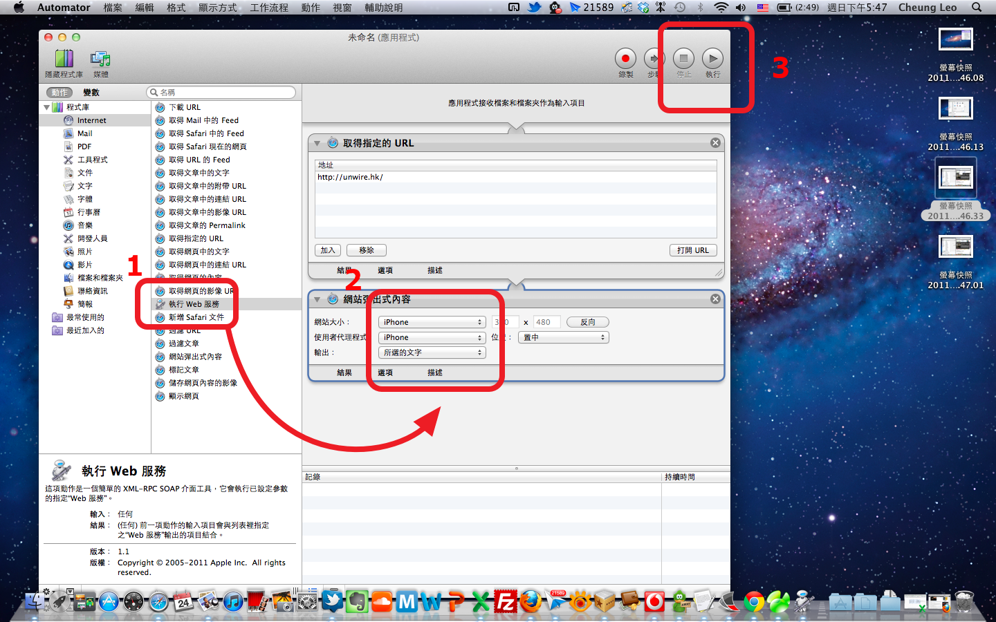 Step3. 接著,我們要讓網站以 iPhone 的解像度來執行。方法很簡單,只要把左方的「執行 Web 服務」,拖放到流程下方空白位置,再將「網站大小」及「使用者代理程式」皆設定為「iPhone」就可。最後於右上方按「執行」就可以預覽執行效果。