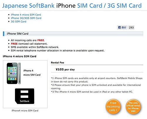 Softbank Rental應該是最多旅客認識的租機/卡方案,重點是方便,因在各大機場便有櫃位就算無預約亦很大機會可以租得到。租SIM卡的話一天的租金僅105円,而上網的收費則為每128bytes 收0.32 円,但有設封頂位,以租卡日數乘以1,500円計算。即如租3日的話,最多只需付 4,500円。