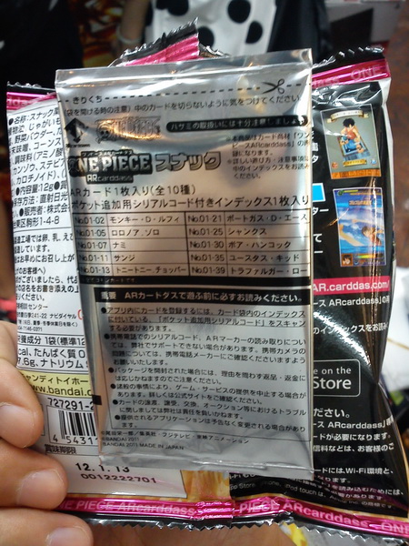 驟眼一看,這應該只是一包普通的零食,但細心留意一下,這包零食原來會附送海賊王的AR卡。雖然只有一張,但售價只需$15,而且有得食有得玩。據說這個包裝中只有附送最基本的卡,但對於沒有需要儲齊全套的一般玩家來說應該是非常足夠的了。各位有下載遊戲Apps的讀者,有空的話不妨到信和中心逛一下,應該還未買完的就是了……